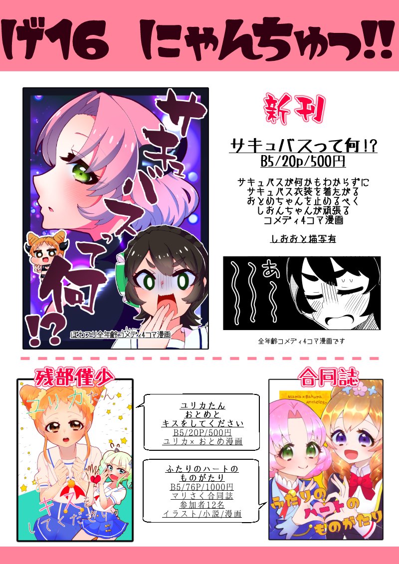 芸カ27のお品書きです~! 新刊はぽわプリコメディ4コマ漫画「サキュバスって何!?」です お品書き→pixiv.net/artworks/99587… 新刊サンプル→pixiv.net/artworks/99566… 既刊ユリおと本・マリさく合同も持っていきます 「げ16 にゃんちゅっ!!」よしなに! #芸カ27お品書き #芸カ27