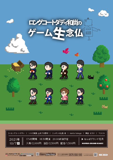 #ロングコートダディ和尚のゲーム生念仏 「ゲーム風ドット絵キャラ」のご依頼。ロゴの絵もYouTubeを参考に描きました。RPG風。 #ロングコートダディ #シカゴ実業 #ニッポンの社長 #滝音 #kentofukaya #マユリカ #design #フライヤー依頼 #お笑いライブチラシ #お仕事募集中 #芸人似顔絵 #イラスト