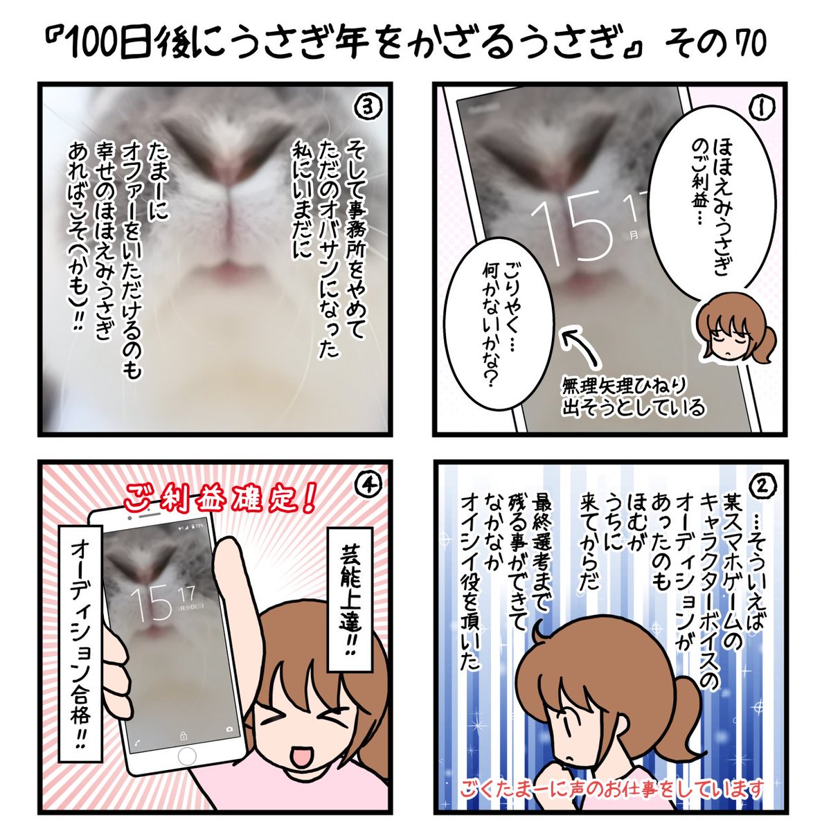 🐰🐰🐰リツイートしたら、このマンガの "幸せのほほえみうさぎ画像" をプレゼント中です〜🐰 👉 nextsphere.jp/Rabbit100Days/… ぜひシェアしてください〜🙏 『100日後にうさぎ年をかざるうさぎ』その70 #芸能ニュース #オーディション #声優 #RT希望 #漫画が読めるハッシュタグ