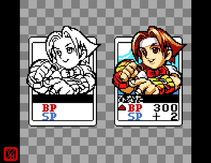 NPC『激突カードファイターズ』より、若葉ひなたのカードを模写してみたゾ。 ついでに親友の春日野さくらと並べてみた。 #カードファイターズ #ジャスティス学園 #若葉ひなた #春日野さくら #カプコン #ネオジオポケットカラー #ドットアーティスト #ドット絵 #レトロゲーム