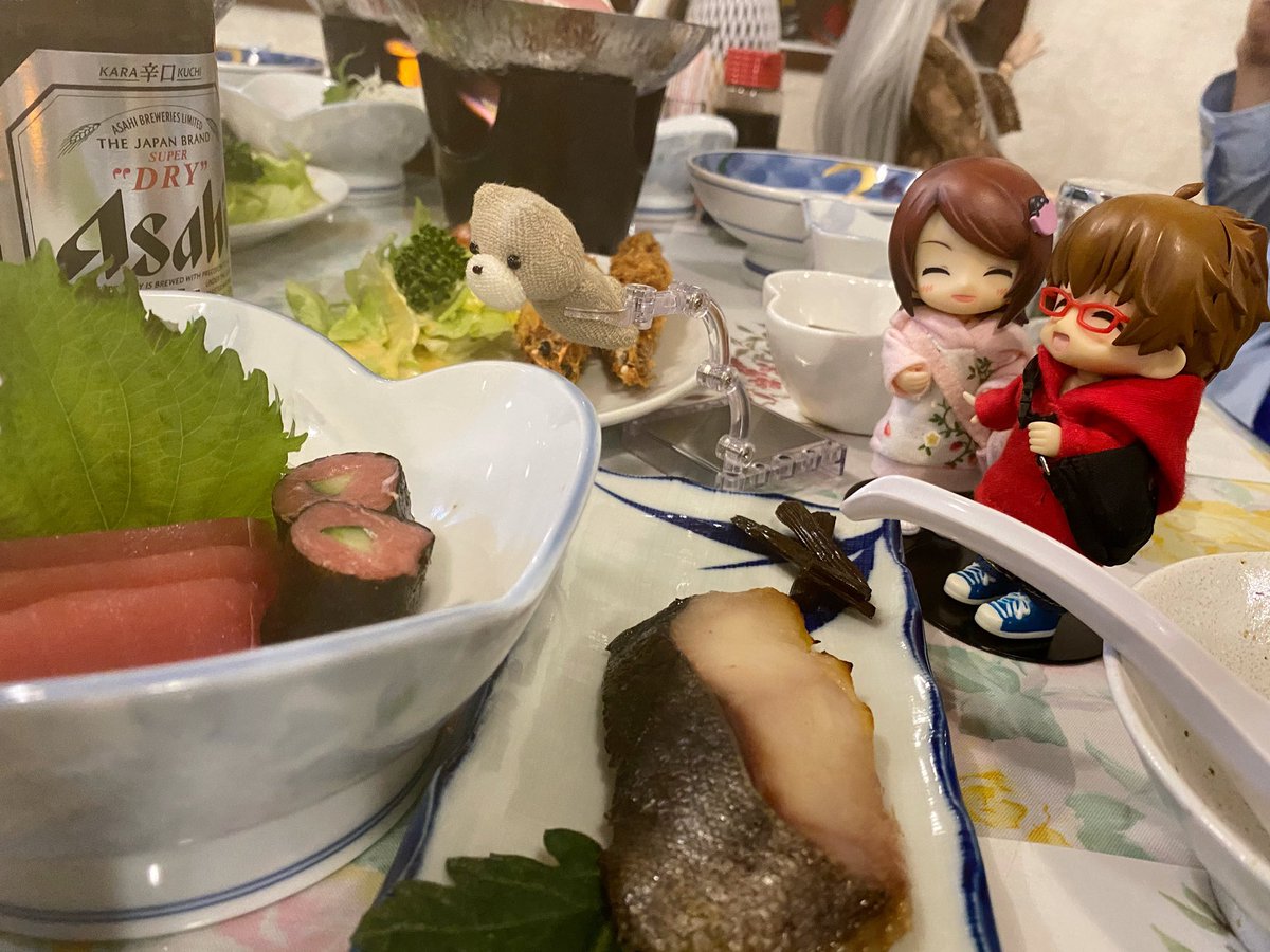 お宿についたらグリちゃん、お風呂に入って晩ごはんですよ☺️ あら、ビールをすでに空けてる人がいますね😆 グリちゃんもお風呂に入ろうね😆 たくさんお食べ😆 トリ🐔さんやカエル🐸さんと絡めておけばよかったです😆 #キューポッシュ #子ぐまのグリちゃん #草津温泉 #草津温泉ドール撮影会 #草津