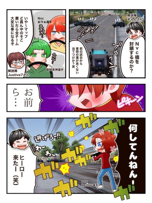 【荒野E-スポーツ四コマ漫画 - 035】 『Nvcが橋封鎖する中、乱入するえむちゃ選手』 📺試合アーカイブはこちら✨ youtube.com/@KnivesOut/str… #漫画が読めるハッシュタグ #荒野行動 #KOPL