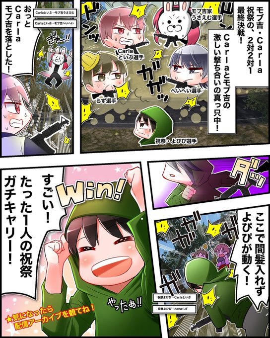 【荒野E-スポーツ四コマ漫画 - 023】 『祝祭よぴぴ選手が最後で一人キャーリー😎』 漫画化したいシーンがあったら、毎週の最終結果のコメント欄で気軽に教えてね 📺面白いと思ったらぜひアーカイブも見てね✨ youtu.be/CBJqETanIl0 #荒野行動 #KOPL #漫画が読めるハッシュタグ
