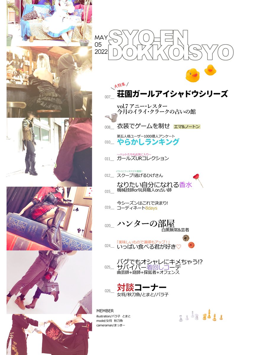 【サンプル】 2022/5/4 スパコミ 残狂ハルシネイト 第五人格コスプレ×イラスト本 🐺🐟🍅🌹 ☆新刊☆ 月刊誌『Shouen Dokkoisho』 価格 1000円 P.まっきー #荘園どっこいしょ twitter.com/okamix123/stat…