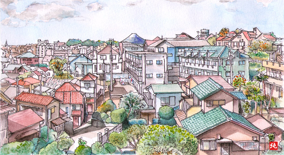 富士山がよく見える横浜・菊名の丘から。#東急東横線 #港北区 #菊名 #イラスト #ペン画 #水彩画 #風景画 #スケッチ #illustration #watercolor #landscapepainting
