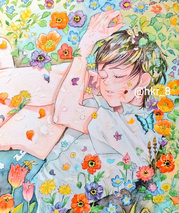 「花埋め少年」 花に埋もれる華をイメージして描きました🌼✨ #華に魅せられて こちらの企画展にて展示させ頂いてます🙌🏻 他にもミニ原画やイラスト集も販売中です🌼 よろしくお願いします✨ #芸術の輪 #アナログ絵 #イラスト好きな人と繋がりたい #一次創作 twitter.com/nachiko25/stat…