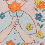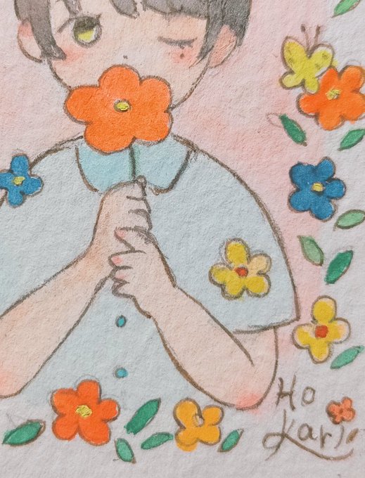 「花埋め少年~フラワー~」 絵本のようなシンプルなタッチで可愛らしく描きました🌼☺🌷🦋 #華に魅せられて #月織堂 #アナログ絵 #ミニ原画 #イラスト好きさんと繋がりたい #手描き twitter.com/hkr_8/status/1…