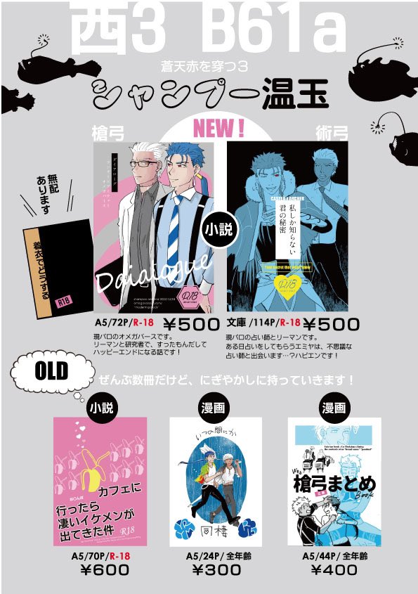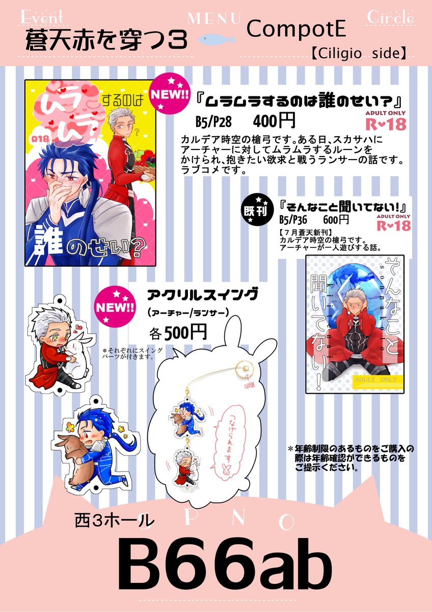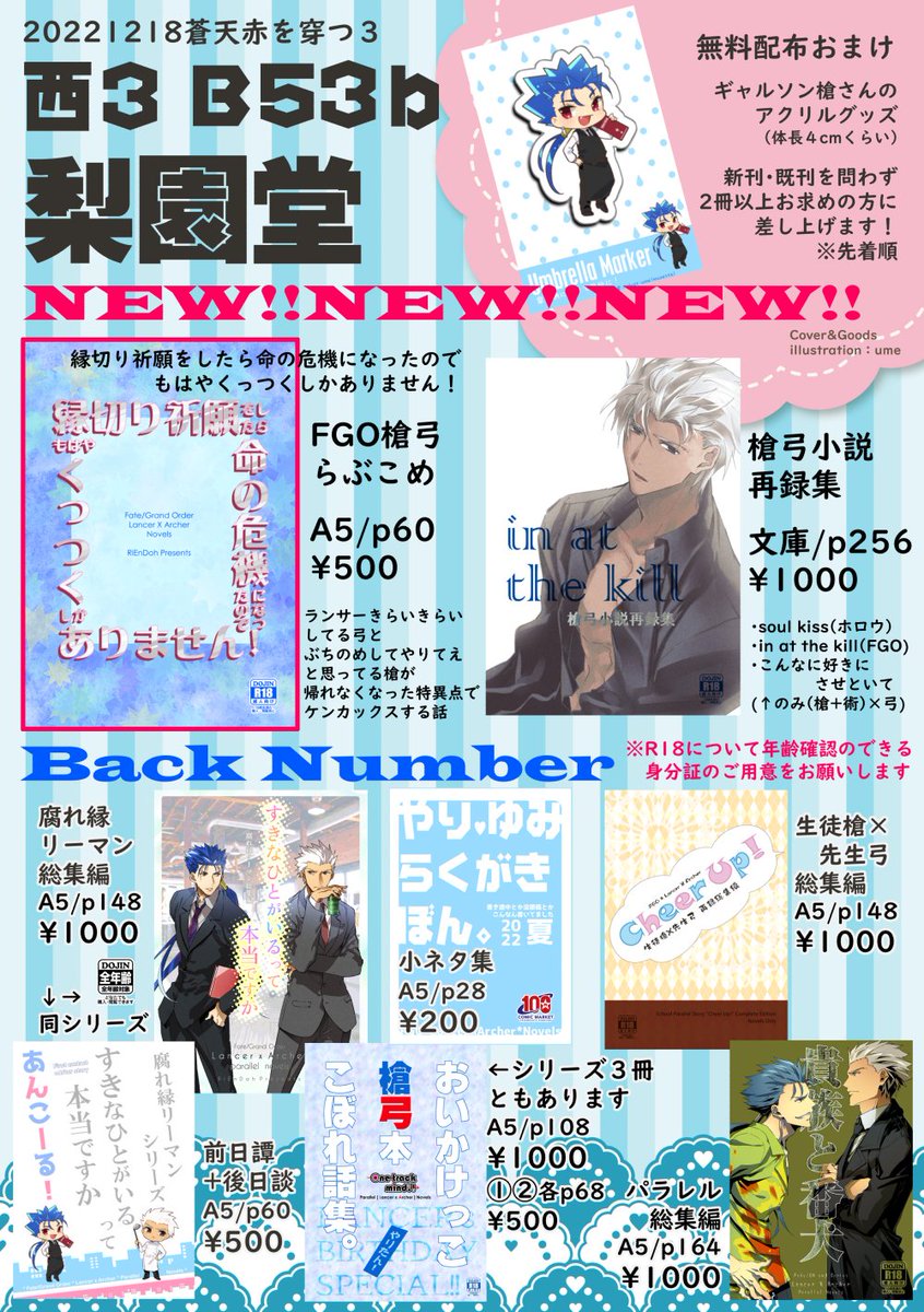 12/18蒼天3のお品書きを作りました! 新しいものは新刊ふご槍弓らぶこめ+再録文庫+ノベルティです。既刊など詳細はここからどうぞ→pixiv.net/artworks/10358… よろしくお願いします! #蒼天赤を穿つ3