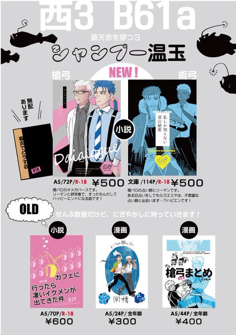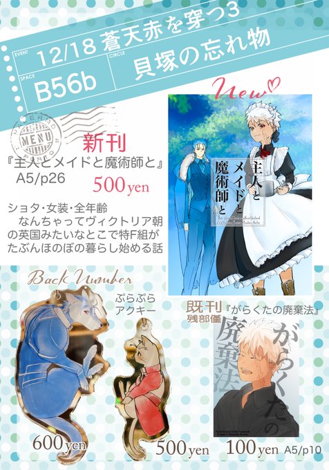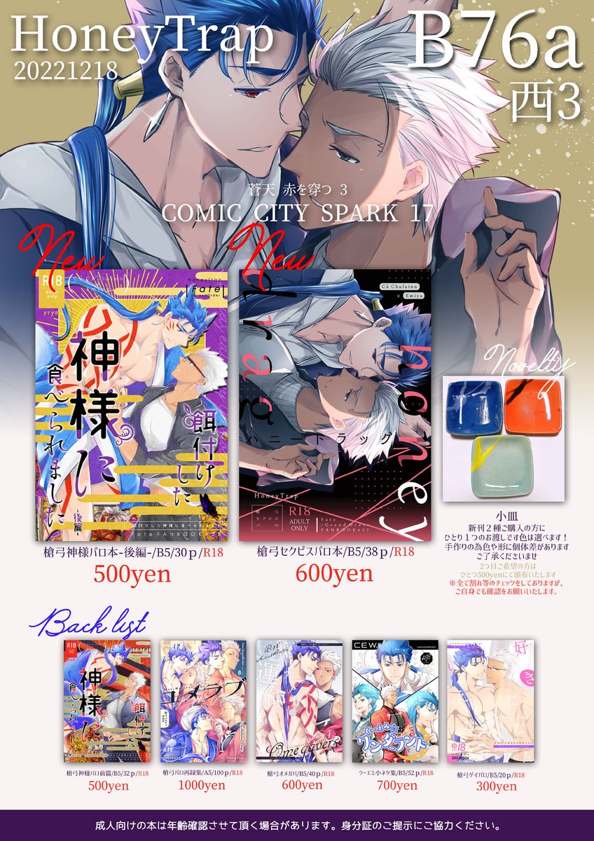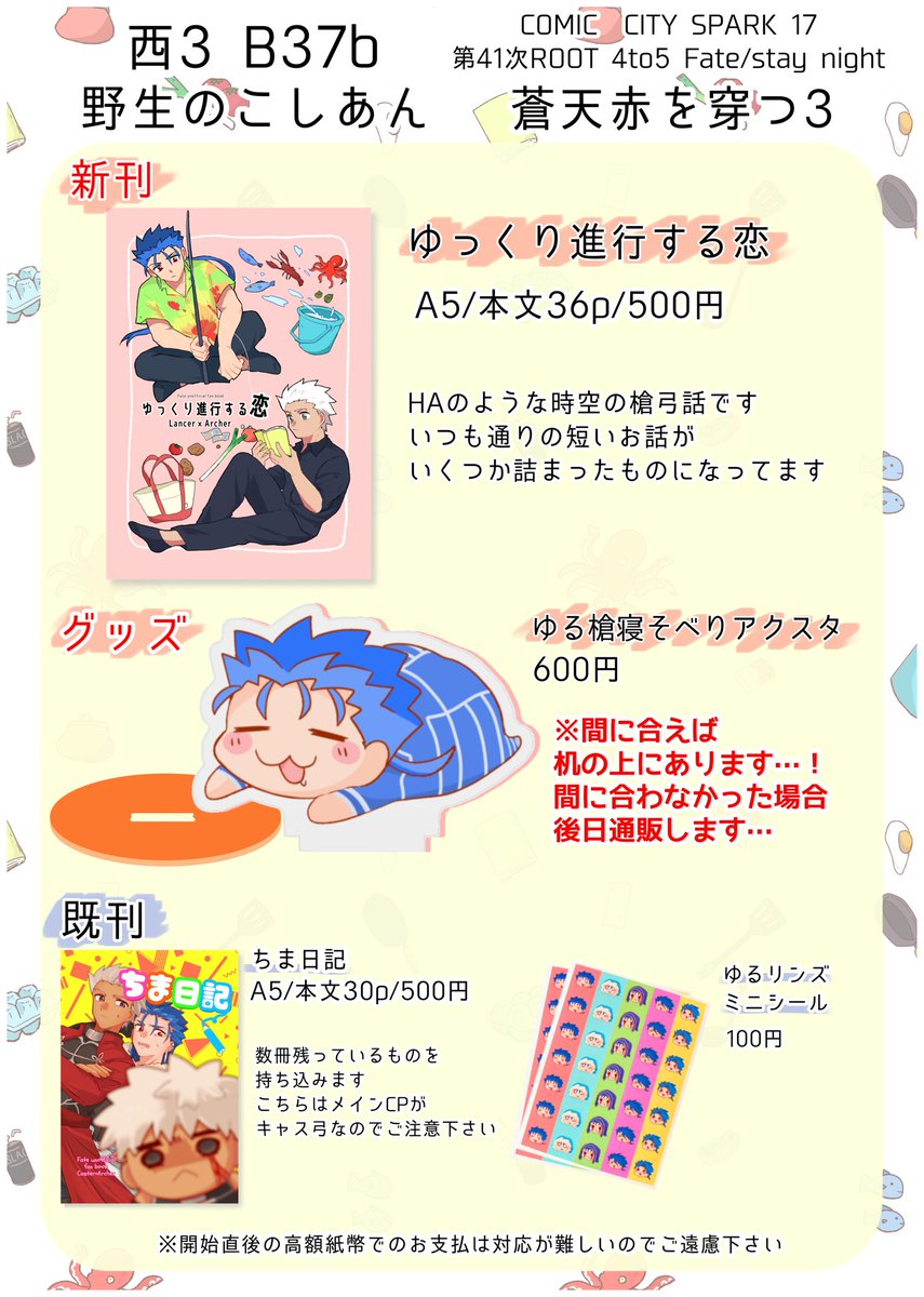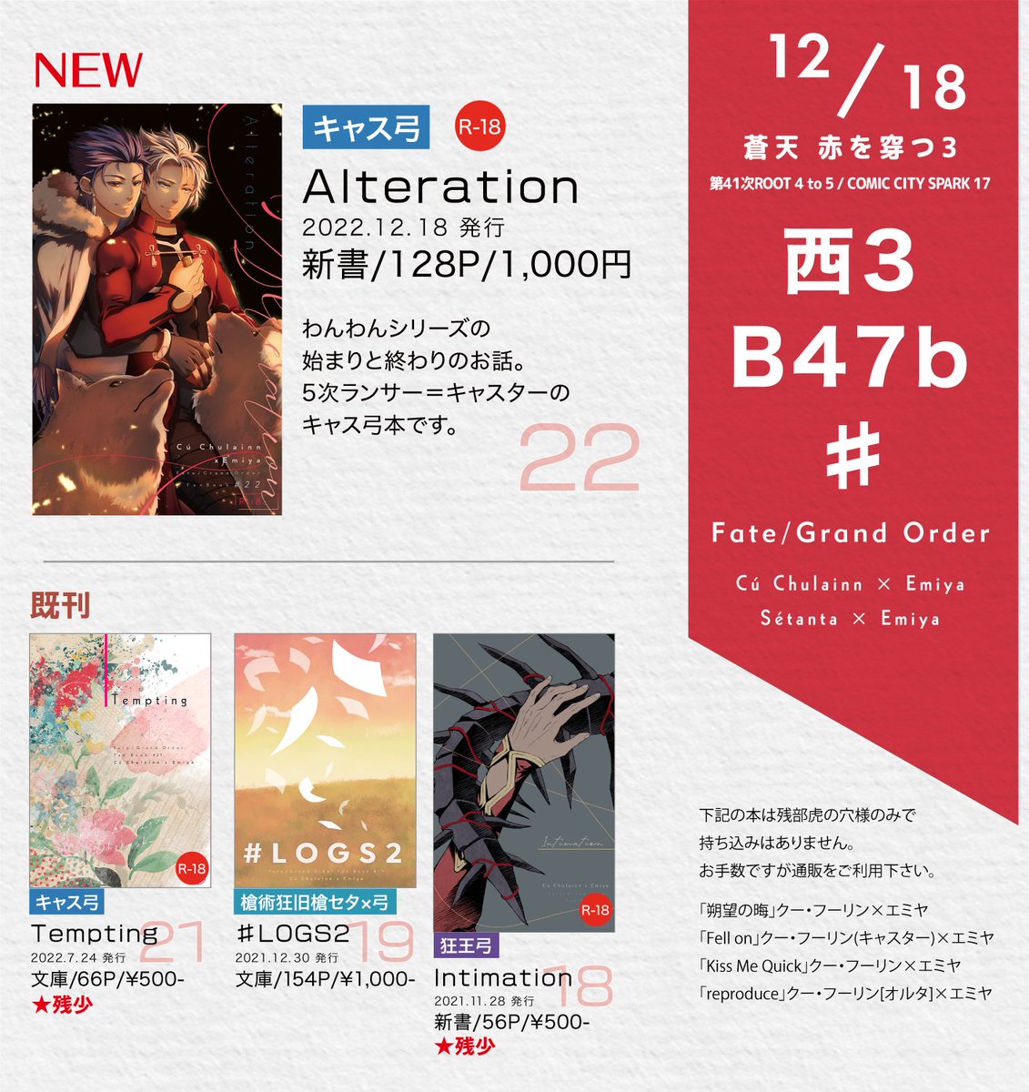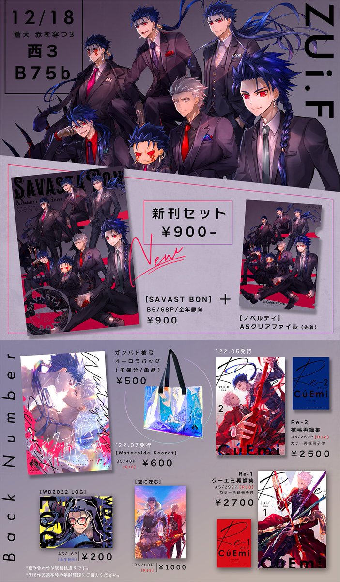 12/18 SPARK17/第41次Root4to5/ #蒼天赤を穿つ3|西3 B75b「ZUi.F」お品書きです 新刊はSNSをするクーエミ本+クリアファイル付です! 他ガンバト槍弓、再録2種、槍術弓、WD狂王本、あと予備分でよけてたオーロラバッグ単品頒布します!よろしくお願いします! pixiv.net/artworks/10363… twitter.com/zuif_d/status/…