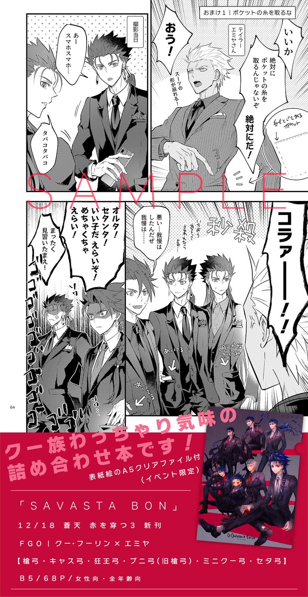 12/18 #蒼天赤を穿つ3 |西3 B75b「ZUi.F」新刊 『SAVASTA BON』B5/68P/全年齢向 カルデアSNSがテーマのクーエミ詰め合わせ本。槍弓・キャス弓・狂王弓・プニ弓・ミニクー弓・セタ弓+クー族わっちゃり →Pixiv|pixiv.net/artworks/10358… →とらさん|ec.toranoana.jp/joshi_r/ec/ite… 槍・術・all (1/2)