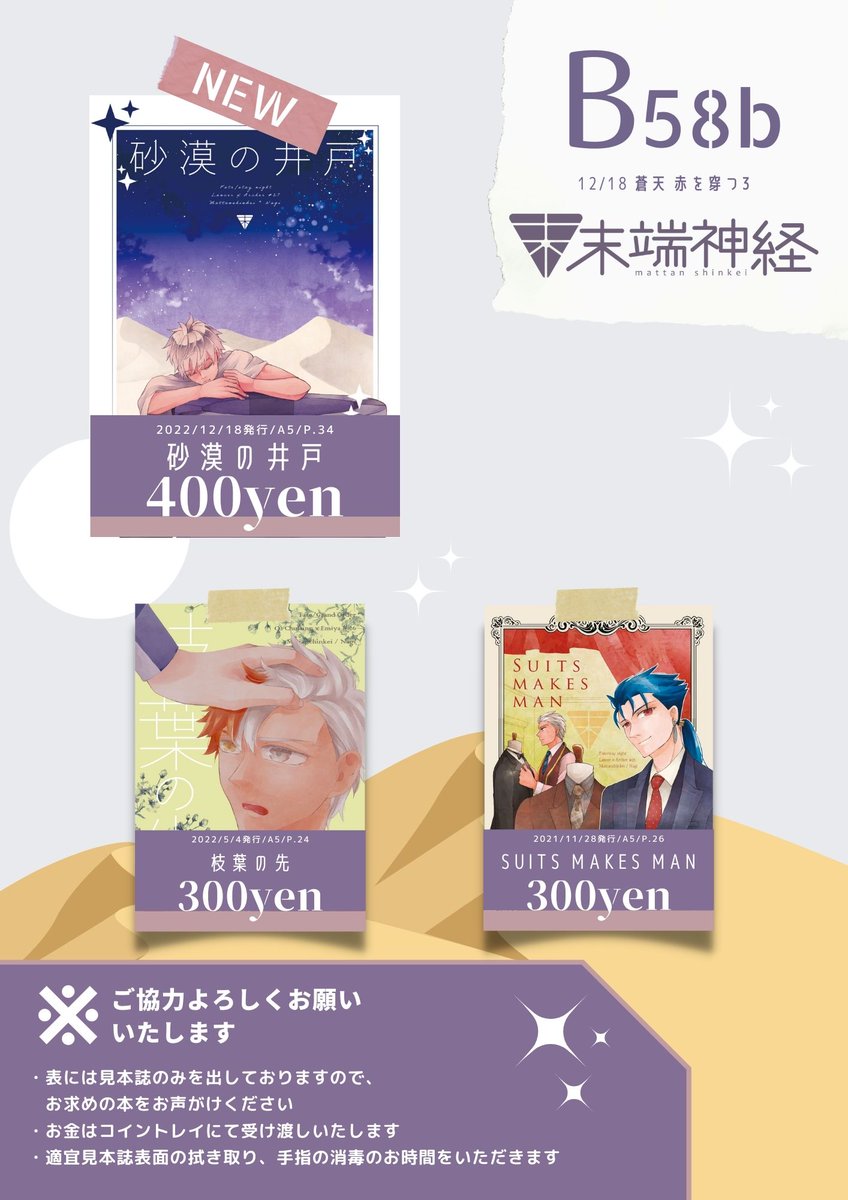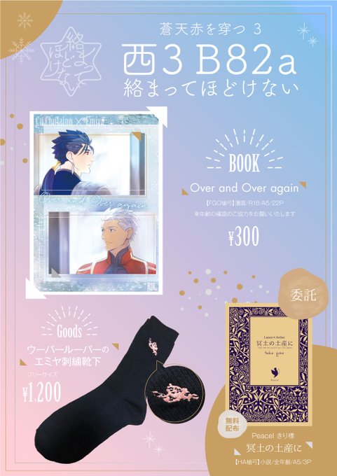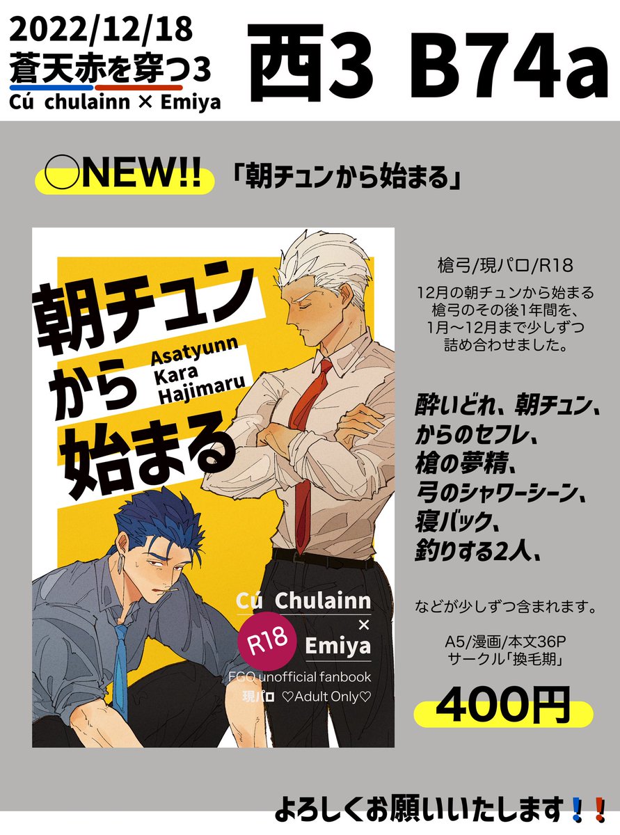 【12/18 #蒼天赤を穿つ3 お知らせ】 スペースNo:西3ホール B58b 末端神経 新刊サンプル(槍弓・全年齢):pixiv.net/artworks/10341… 書店委託: ecs.toranoana.jp/joshi/ec/item/… 一人参加のため、席を外している場合もあります。 当日寒そうなので暖かくしてお越しください! 宜しくお願いいたします🙇♀️