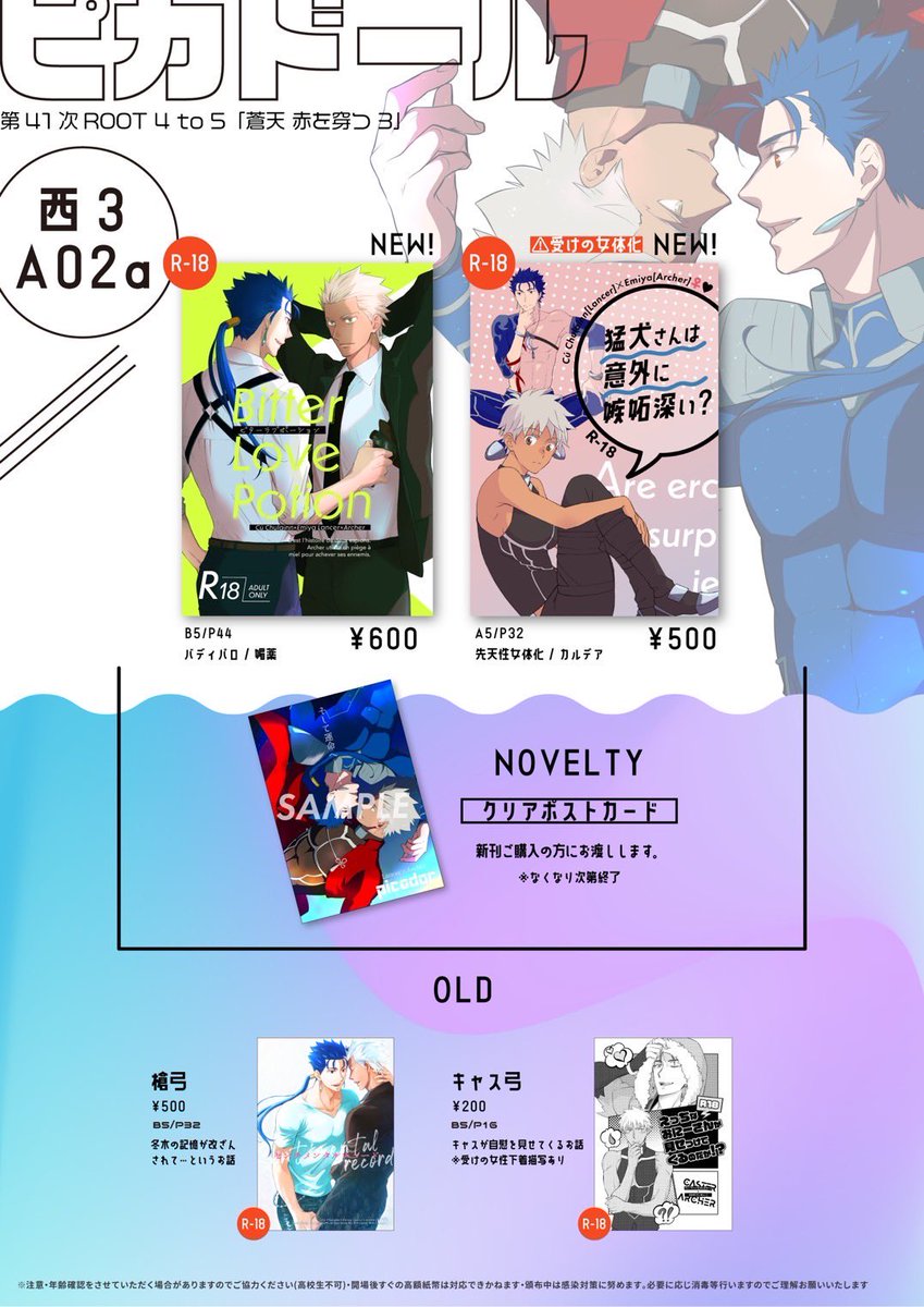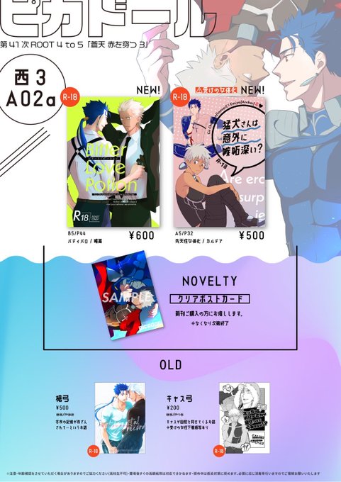 お品書きアップしました。 ノベルティはいつものようにしおりカードです! 「Tempting」(キャス弓)、「Intimation」(狂王弓)の二種は残部片手以下です。 新刊はなくならないと思いますが、取り置きを希望される場合はDM等でお知らせください。 #蒼天赤を穿つ3 pixiv.net/artworks/10358…