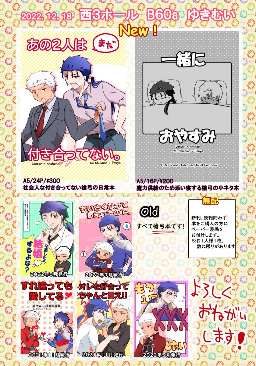 12/18蒼天3のお品書きを作りました! 新しいものは新刊ふご槍弓らぶこめ+再録文庫+ノベルティです。既刊など詳細はここからどうぞ→pixiv.net/artworks/10358… よろしくお願いします! #蒼天赤を穿つ3