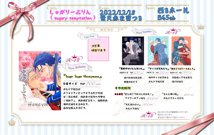12/18のお品書きです!当日は宜しくお願いいたします〜ッ🙇♀️ 通販は現在在庫切れとなっていますが、12/18のイベント後に手元に残った分を追納予定です📦 もし万が一会場搬入分が当日完売しても、再販&後日とらさんにて通販しようと思っていますので、無理せずお越しくださいませ~🙇♀️! #蒼天赤を穿つ3 twitter.com/monpuchi_marke…