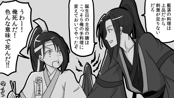 魏嬰の手料理を自分以外が食べたと知っても、誕生日だからきっと含光君も多めに見てくれるよ。 辛くて倒れるかもだけど。 #蓝景仪0824生日快乐 #藍景儀0824生日快乐 #HappyLanJingyiDay #魔道祖師落書き 無駄に嫉妬深くなければ含光君ではない。その17。