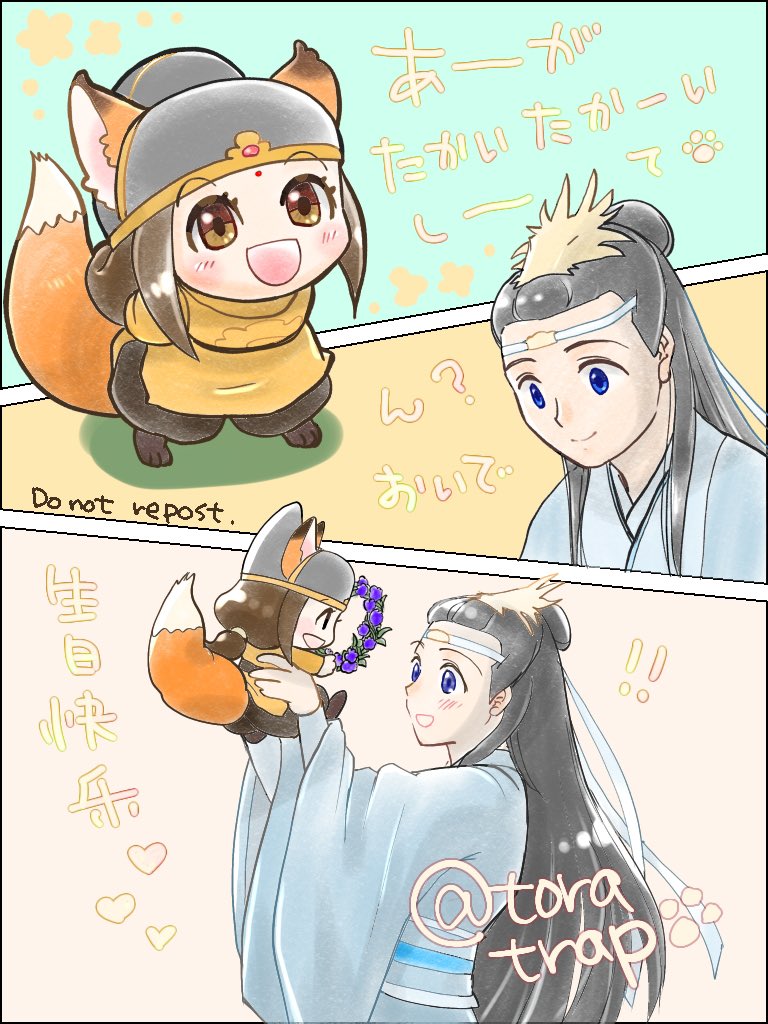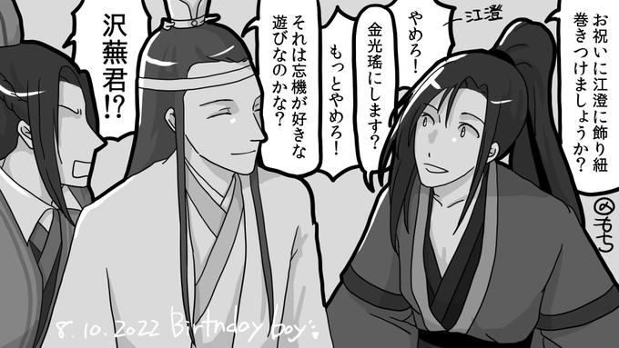 #蓝曦臣1008生日快乐 #1008藍曦臣生誕祭 #HappyLanXichenDay 沢蕪君をからかう魏無羨と、からかい返す沢蕪君と、一人であっぷあっぷしてる江澄。 #魔道祖師落書き あーやおなら多分喜んでおリボン巻かれる。