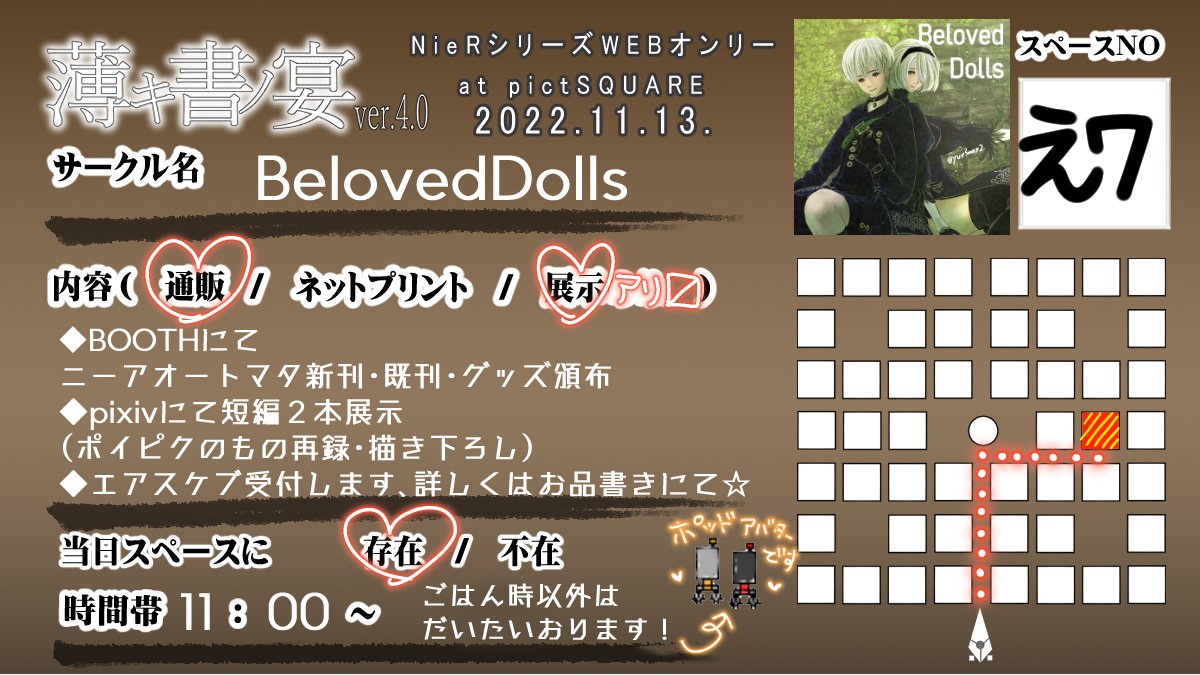 薄キ書ノ宴ももう4回目✨👏👏👏👏 【え7】にスペース頂きました! 9S2B本の新刊、グッズをBOOTHにて頒布いたします!展示ももりもり💪✨エアスケブも受付します、わいわい出来るのが楽しみです☺️ #薄書4サークル参加