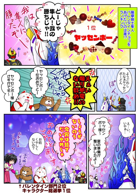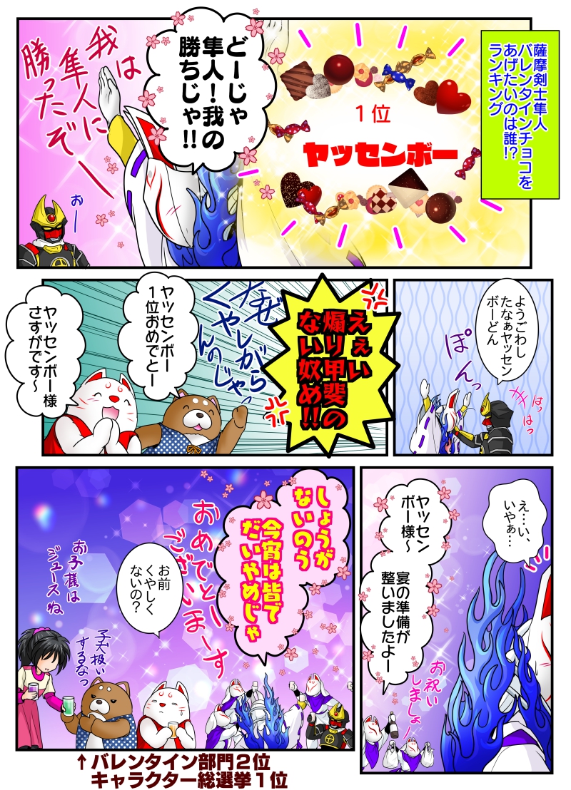 薩摩剣士隼人の「バレンタインチョコをあげたいのは誰!?ランキング」結果発表の日はきっとこんな感じだったんだろうな~ …というお話をした(↓)ので描いてみました mobile.twitter.com/yuni_bokkemon/… #漫画 #Web漫画 #鹿児島 #薩摩剣士隼人 #この世界観ほんと好き