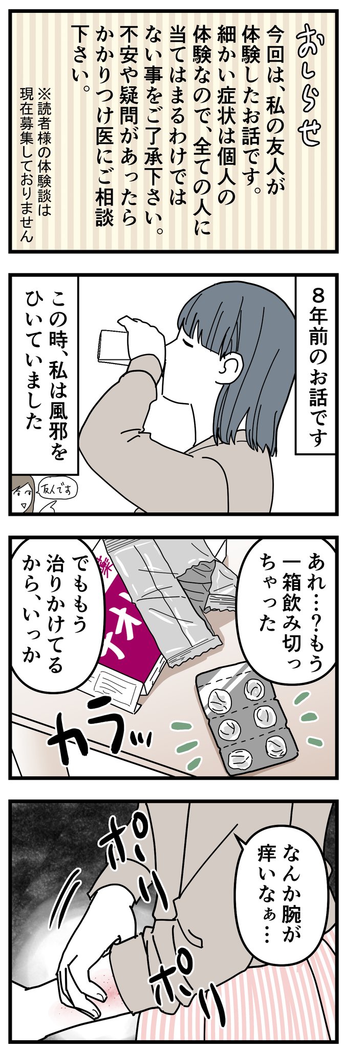 薬疹になって市販薬が飲めなくなった話1 友人の体験談です。「自分のしくじり体験が、皆さんへの注意喚起になるなら」と、ご厚意で話してくれました。詳しくはブログ記事に補足などあります↓ chikumasara.blog.jp/archives/31652… #漫画が読めるハッシュタグ #エッセイ漫画 #薬疹