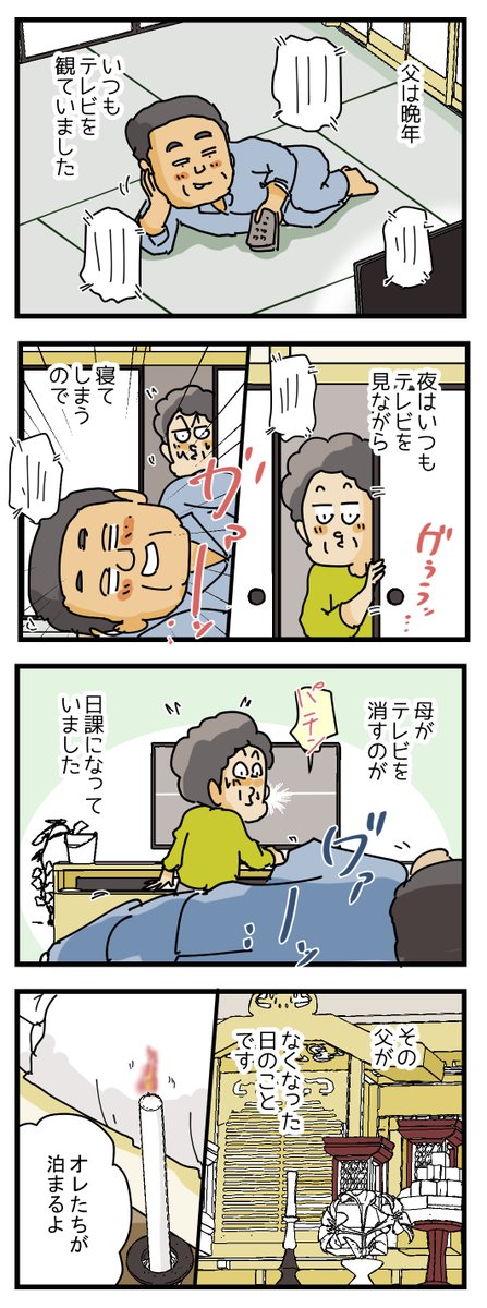 『お父さんのテレビ』1/4 父が亡くなった夜に体験した、不思議な出来事 #コミックエッセイ #虫の知らせ #漫画がよめるハッシュタグ ブログはこちら↓ ameblo.jp/yukitanoyonkom…