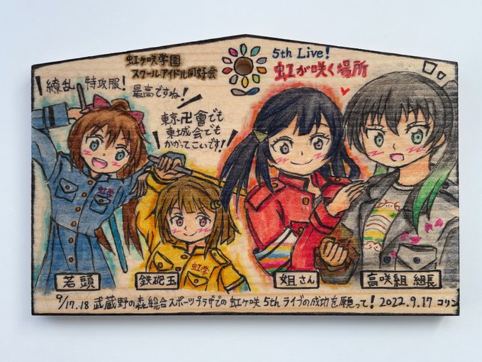9/17.18 武蔵野の森総合スポーツプラザにて開催される【虹ヶ咲学園 5th Live! 虹が咲く場所】ライブ開催を記念して、高咲侑.優木せつ菜.中須かすみ.桜坂しずくの繚乱衣装姿を神田明神の絵馬に描きました。 最高のライブになりますように(・∀・) #lovelive #虹ヶ咲 #虹5thNT_day1 #虹5thNT_day2