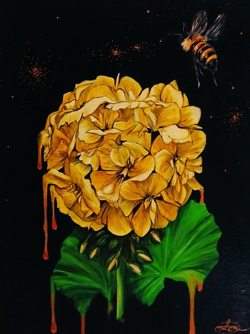 【メルティーフラワー】 黄ゼラニウム 花言葉:予期せぬ出会い #油絵 #絵描きさんと繫がりたい #蜂 #植物画 #みんなで繋がるTwitter展覧会 #illustration #artwork #絵柄が好みって人にフォローされたい