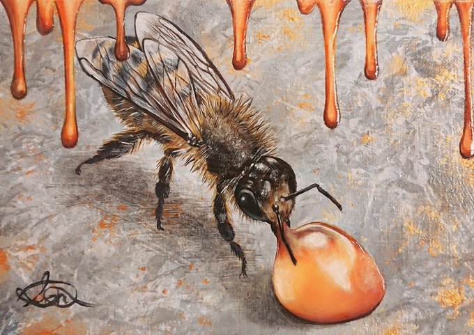 【蜜の味】油絵 蜜の表現を試行錯誤しました🐝 楽しく蜂を描けてました(^.^) #アナログイラスト #芸術の輪 #蜂 #絵描きさんと繫がりたい #artwork #アナログ絵を流してアナログ民を増やそう
