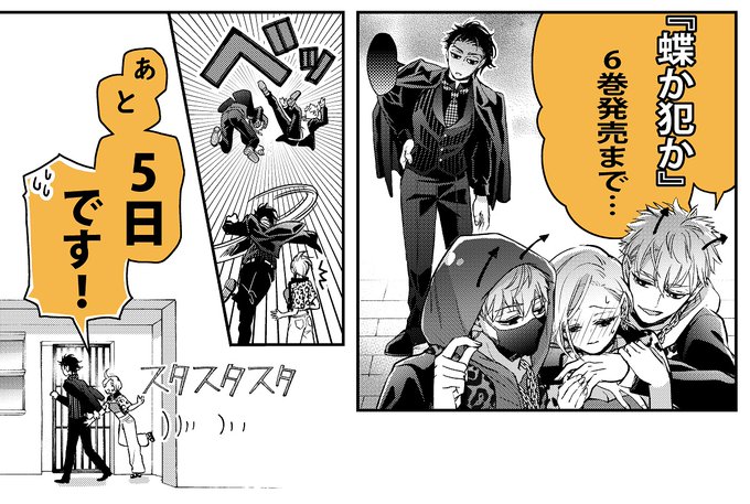 🦋『蝶か犯か』6巻単行本発売カウントダウンです🦋 4月13日発売になります✨ ツイッターキャンペーンも行う予定です。こちらはまたお知らせいたします~🎉 何卒宜しくお願い致します🙇♀️ ↓予約開始されてます amazon.co.jp/%E8%9D%B6%E3%8… #蝶か犯か