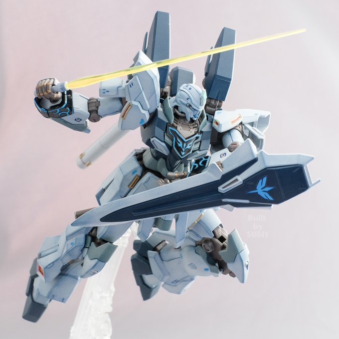 #今月作ったプラモ晒そうぜ 続き> #袖付き 意匠の水色は水性マーカー #ポスカ の極細で。不器用なアタシには、筆よりも塗りやすいのですよねぇ。その他の部分塗装も全てマーカーです。 #シナンジュスタイン #ガンプラ #ガンプラ好きと繋がりたい