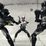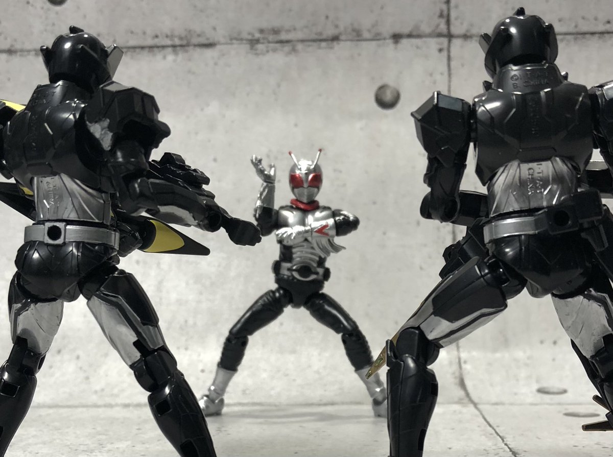 #夜のフィギュア撮影会 お題「怪」 たったひとりで怪人達との戦いを続ける姿は昭和ライダーのならではの魅力だと思います。 今回怪人役をワンダフルさんとパワフルさんにお願いしましたが、いい後ろ姿でした。 #掌動 #仮面ライダースーパー1 #装動セイバー