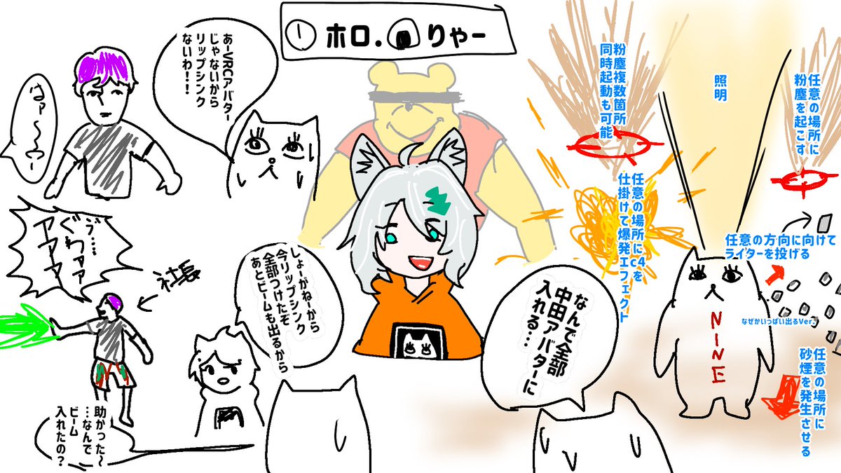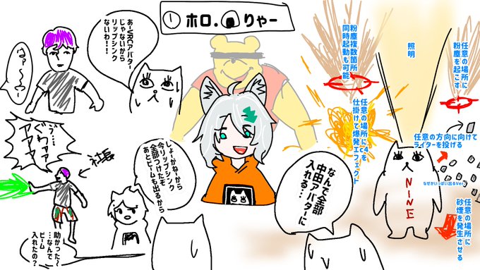 #裏NINE そうそう。初期は⑨氏がフルトラを使えない環境にあったので一時的にホロくんが⑨氏の動きを担当しました。そのおかげでケーブル巻き取りシーンは素晴らしい画になりましたが、ホロくんはめっちゃ姿勢良くてキビキビ動くのでなので本人から「もっと猫背でダルそうに!」とすごい言われていた。 twitter.com/laughingman204…