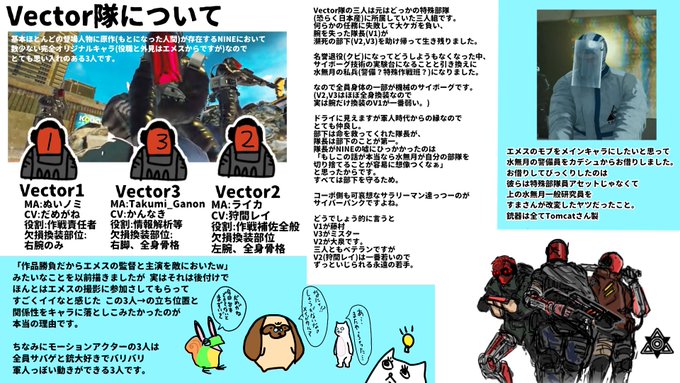 #裏NINE EMETHでは主人公とカタキ役、NINEではもう一人の主人公の声を演じたかんなき先生( @kan_naki ) 改めて考えるととんでもないことをしている。 彼女達に加え、実はvector2も演じている。Vector隊についてはまた次回。 twitter.com/nakadarariri/s…