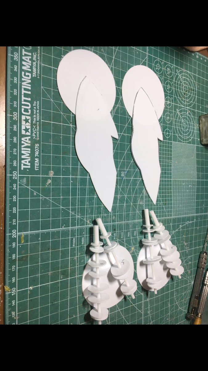 #製作工程を写真4枚で振り返る 製作工程か~。見て面白そうなのはこれかな。 0.5mmプラ棒で模様の輪郭を作って、その内側を瞬間硬化パテで埋めて整える。この4パーツだけで1週間はかかった気がw