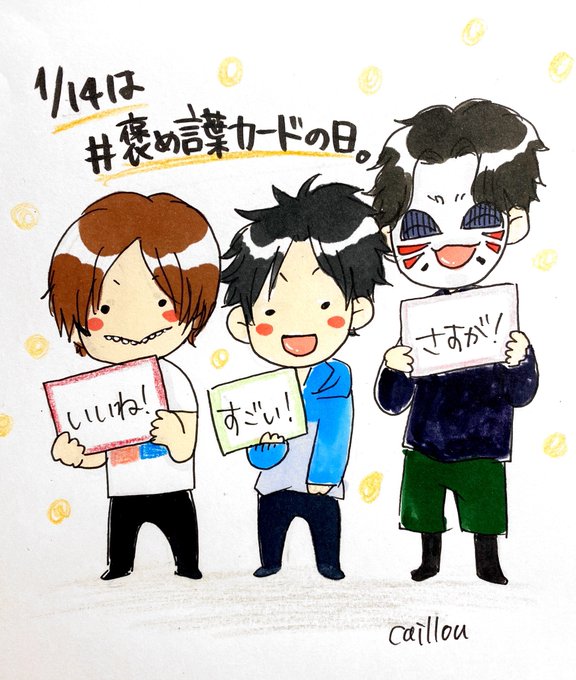 本日のボンバーさんで今日はなんの日も #褒め言葉カードの日。 メンバーさんにそれぞれ褒め言葉のカードを持ってもらいました🙇🏻♀️ 推しにどんな些細なことでも褒めてもらえたら向こう何年かは健やかに生きていられます✨ #イラスト #ファンアート
