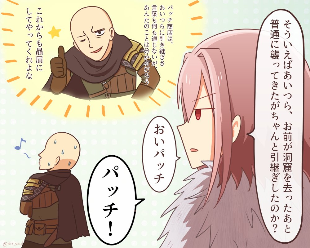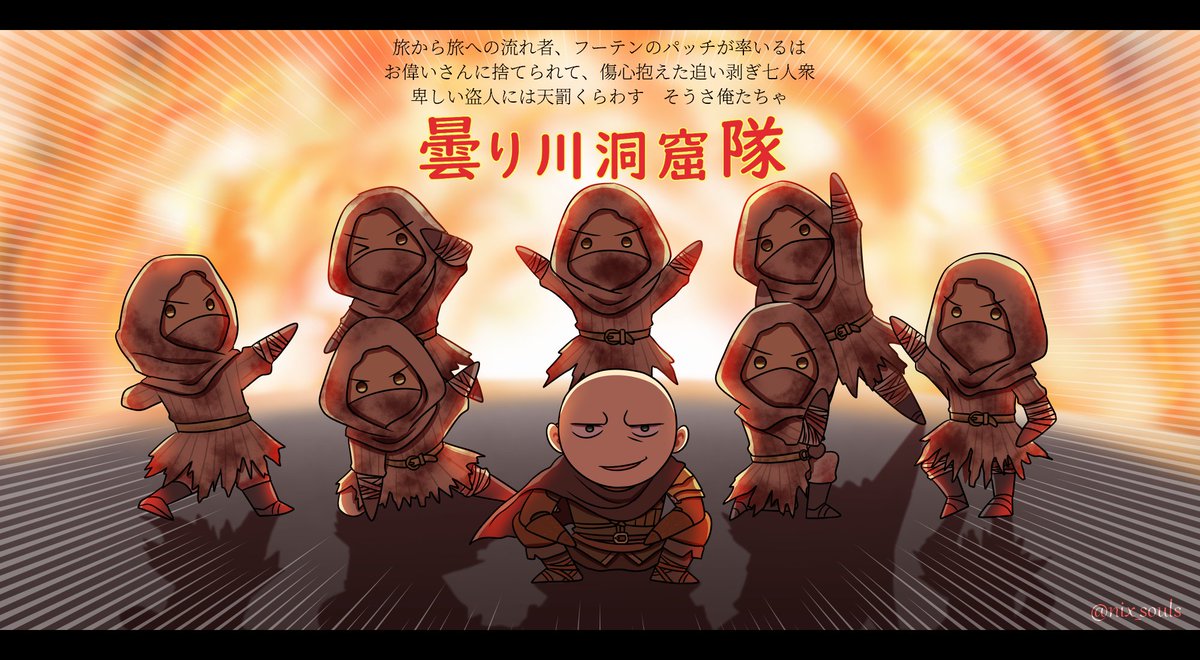 ●劇場版「フーテンのパッチと七人の追い剥ぎ」2022年夏公開!(嘘) あれは引継ぎしようとして言葉が通じなくて失敗したのか、そもそも引継ぎなんてする気はなかったのか… 多分後者なんだろうなあパッチだし… #ELDEN_RING #EldenRingFanart #フーテンのパッチ #褪せ人nix