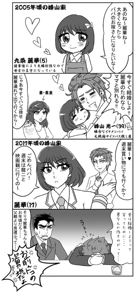 #見た人は4年前後前の絵を晒す 黒歴史やで・・・・あ~~~~~こわいこわいいや・・・むしろ今の紅丸の絵と見比べて画力成長を褒めてくれ(;^ω^) ①初期おっさん大輔の設定画 ②龍二(=大輔の次男)と麗華(=光一の一人娘) ③現存する最古の大チカ ④現存する最古の光一と真里初登場漫画