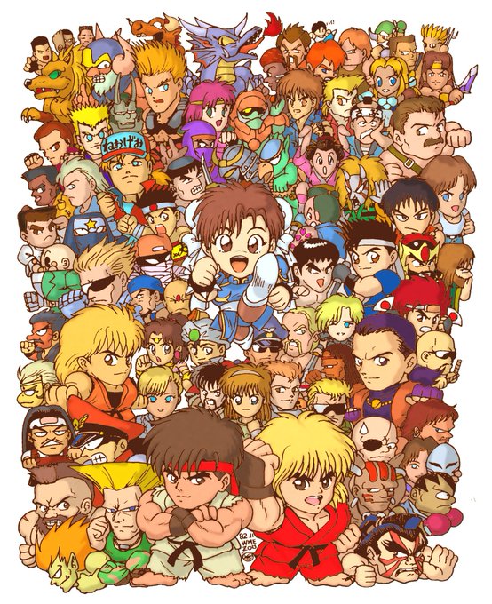 #見た人もなにか無言で大勢をあげる 30年前に描いた格ゲーキャラ集合イラスト おそらくいっぺんに描いた格ゲーキャラ最多人数だと思います😅 細かいキャラクターも多いですが全部わかったらスッゴイ❤ #格ゲーキャラ描こうぜ