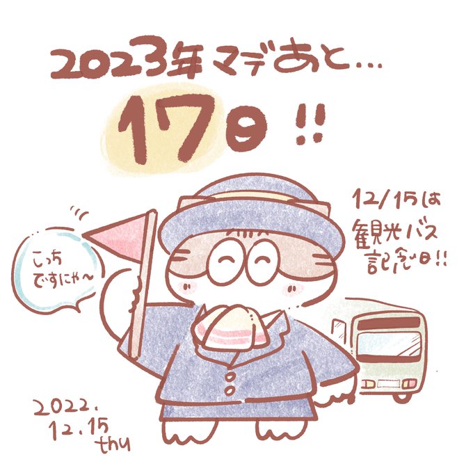 🐈<2023年まであと… 17日! 今日は観光バス記念日!🚌🚩 観光バス乗る度にバスガイドさんの知識量にビックリする…🤔 桃狩りに行ったのが思い出です💭 #あにまるいらすと #もよのイラスト #アニマルイラスト #観光バス記念日 #絵描きさんと繋がりたい #猫好きさんと繋がりたい #猫のいる暮らし