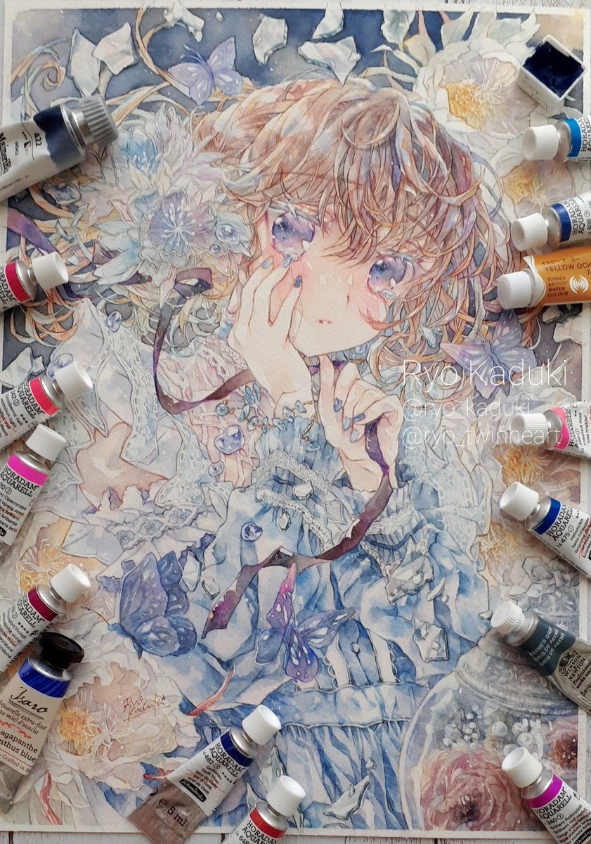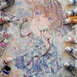 #触れては消えるティアドロップ 対絵、色違いで額装しました〜✨ 壁掛けもスタンドもどちらもOK👍💕 L判サイズの小さな絵です。 今から取り掛かる依頼絵が完成したら、ミニ色紙も何枚か描いていきたいです🤗✨