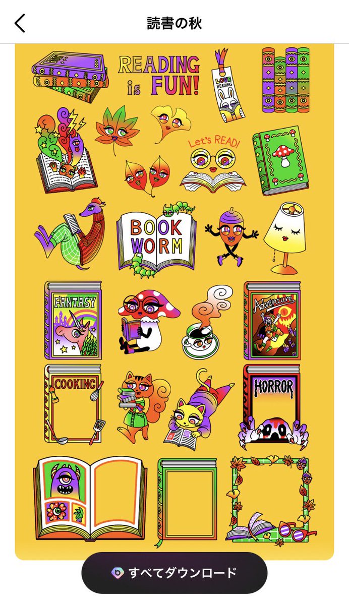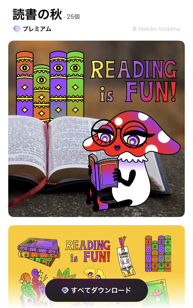 \お知らせ/ カメラアプリ「 #BeautyPlus 」でお使い頂けるMakiko Kodamaデザインのスタンプ第7弾がリリースされました❤️🧡💛 今回のテーマは【読書の秋】📚🍄☕️📚 イラストやフレームを使って、楽しい読書タイム写真を彩ってみてください~📚🍁🍂 #イラスト #illustration #読書の秋 #本