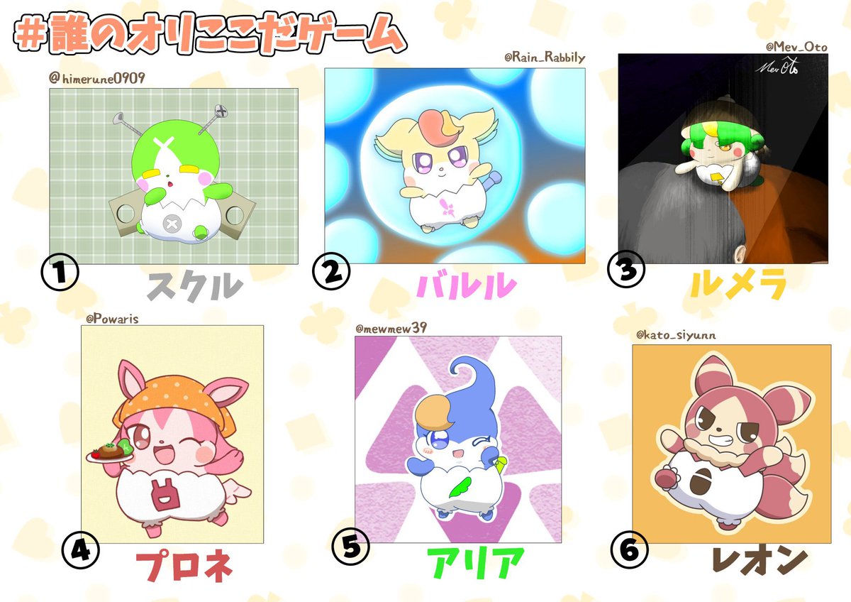 #誰のオリここだゲーム 猫月ヒメさん (@Himerune0909)主催のオリジナルここたまのキャラデザゲーム、私も参加しております。⑥のレオンを描かせていただきました! 私がデザインしたオリジナルここたまは①〜⑤のうちどれでしょうか?投票はリプライツリーよりお願いします。