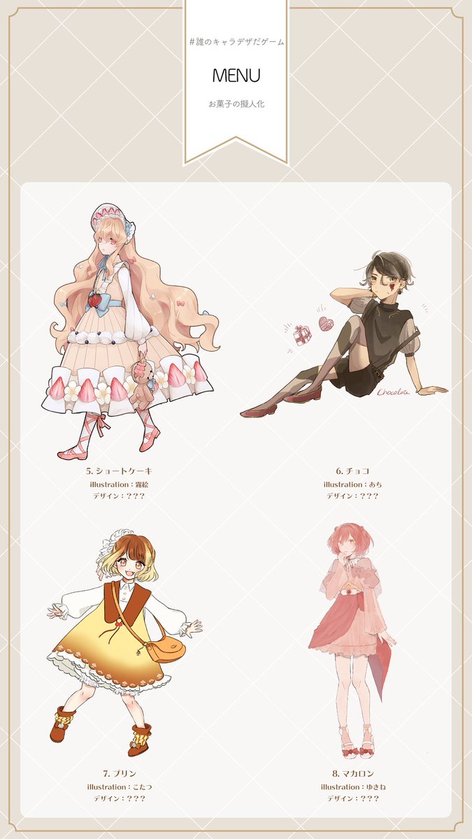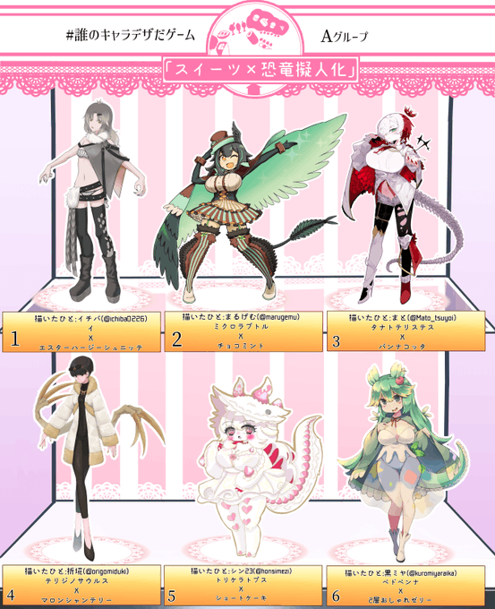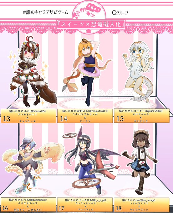 #誰のキャラデザだゲーム ガタスさん(@Gatasu313)主催のスイーツ×恐竜の擬人化です!この中に私がデザインした子がいるので、アンケートに投票してどの子か当ててみてくださいね!🍫🍰🍮🍭✨