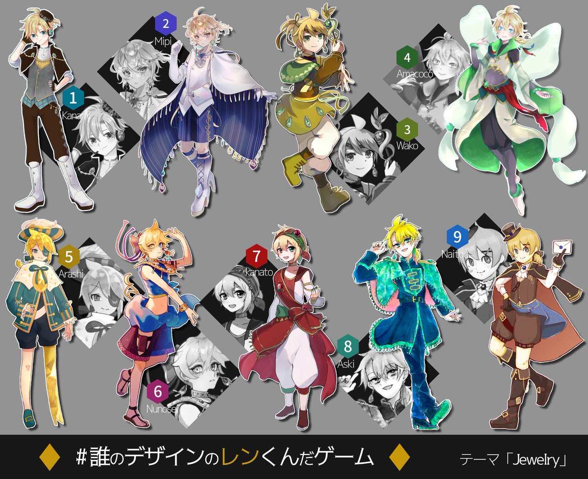 #誰のデザインのレンくんだゲーム 素敵な企画に参加させていただきました。テーマは「宝石」です。かなみは頂いたデザインをもとに1番を描きました。 さて、かなみのデザインした衣装はどれでしょう? リプ欄のアンケートで投票!!これは当てられたらすごい!(かなみのデザインは安定してない為)