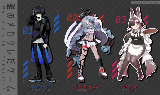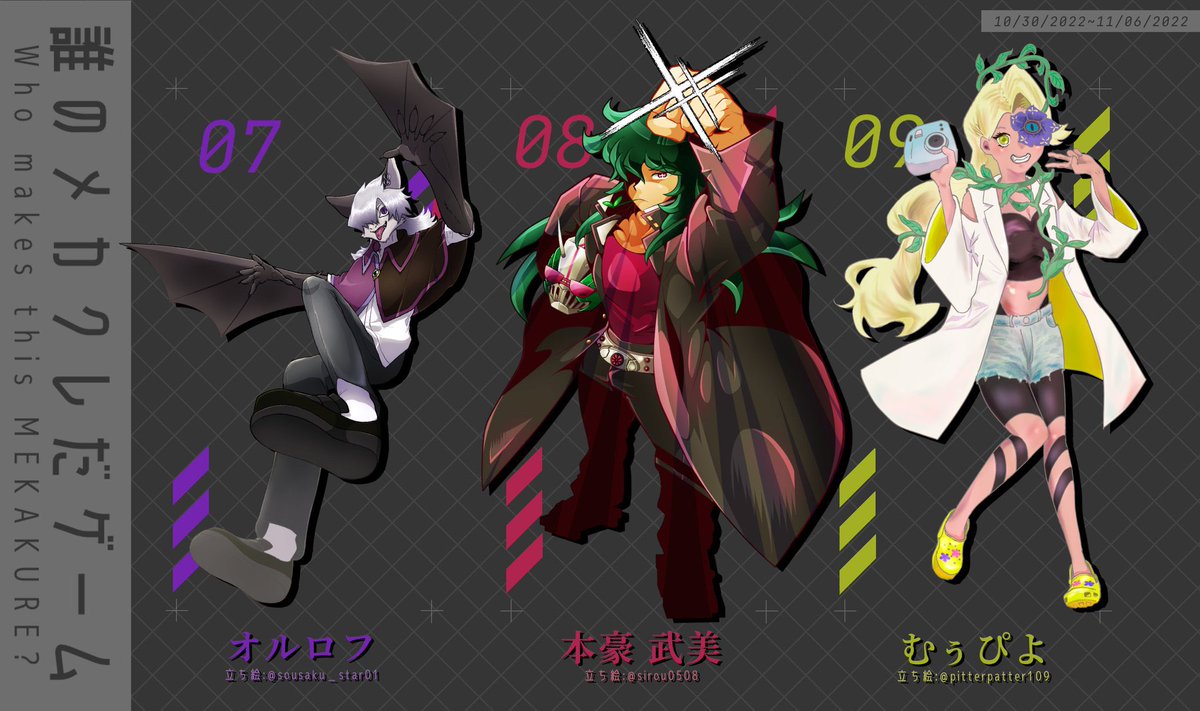 #誰のメカクレだゲーム に参加させていただきました〜!チャイ氏主催ありがとうございます😊 私がデザインした子を当ててみてください!投票はリプから👇 立ち絵を描かせていただいたのは7番のオルロフさんです🦇