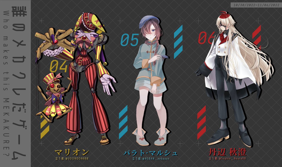 #誰のメカクレだゲーム チャイテーさんの誰デザ企画に参加させていただきました! ○今回のテーマは『メカクレ』 リプにアンケートを繋げるので、私のキャラデザした子を予想して良ければ投票してくださいー!! 立ち絵は、6番の丹辺 秋澄さんを描かせていただきました✨