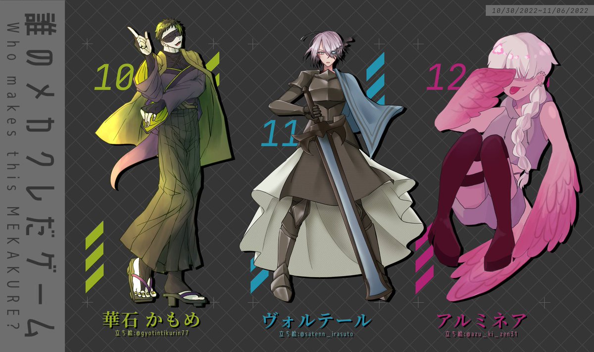 #誰のメカクレだゲーム チャイテー(@ UDONDON888)さん主催の企画に誘っていただきました!…はい! メカクレがテーマの誰デザゲームとなってます! リプにアンケートがあるのでこれはお前のだと思うキャラに投票お願いします!🙏 立ち絵は9番のむぅぴよたそを描かせていただきました!