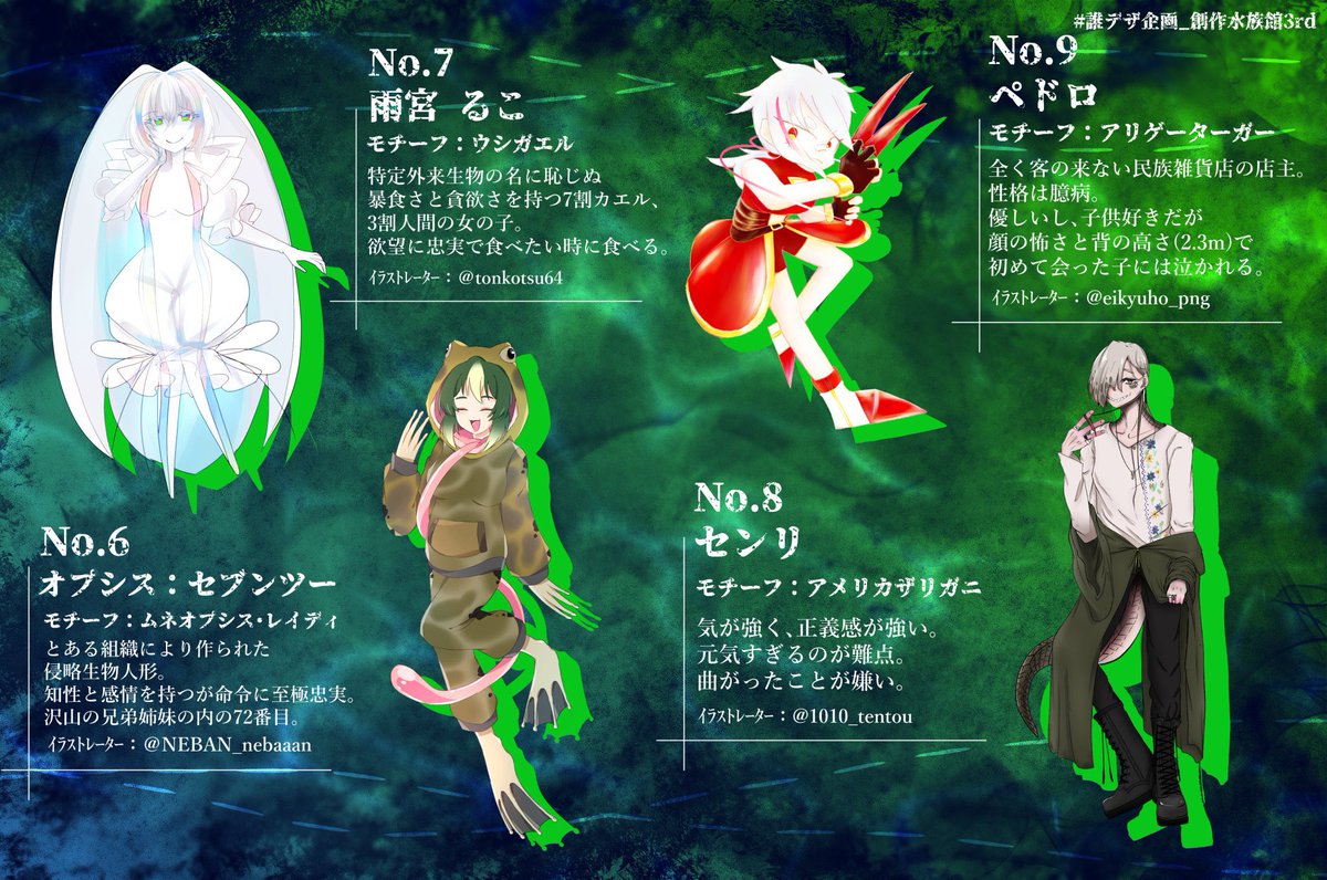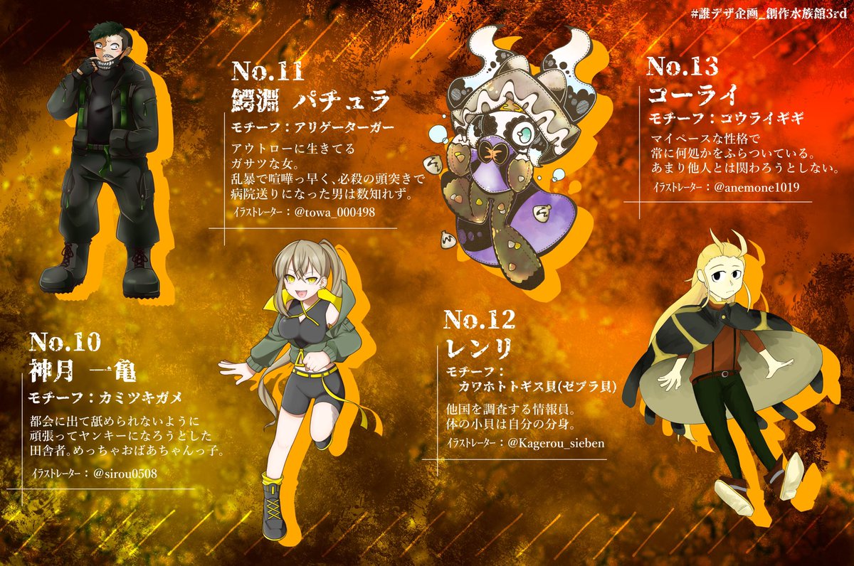 #誰デザ企画_創作水族館3rd に参加しました! 今回私が描いたキャラクターは12番のレンリさんです。 私がデザインを担当したキャラクターは誰でしょう!投票はツリーに繋げます。お気軽にどうぞ!