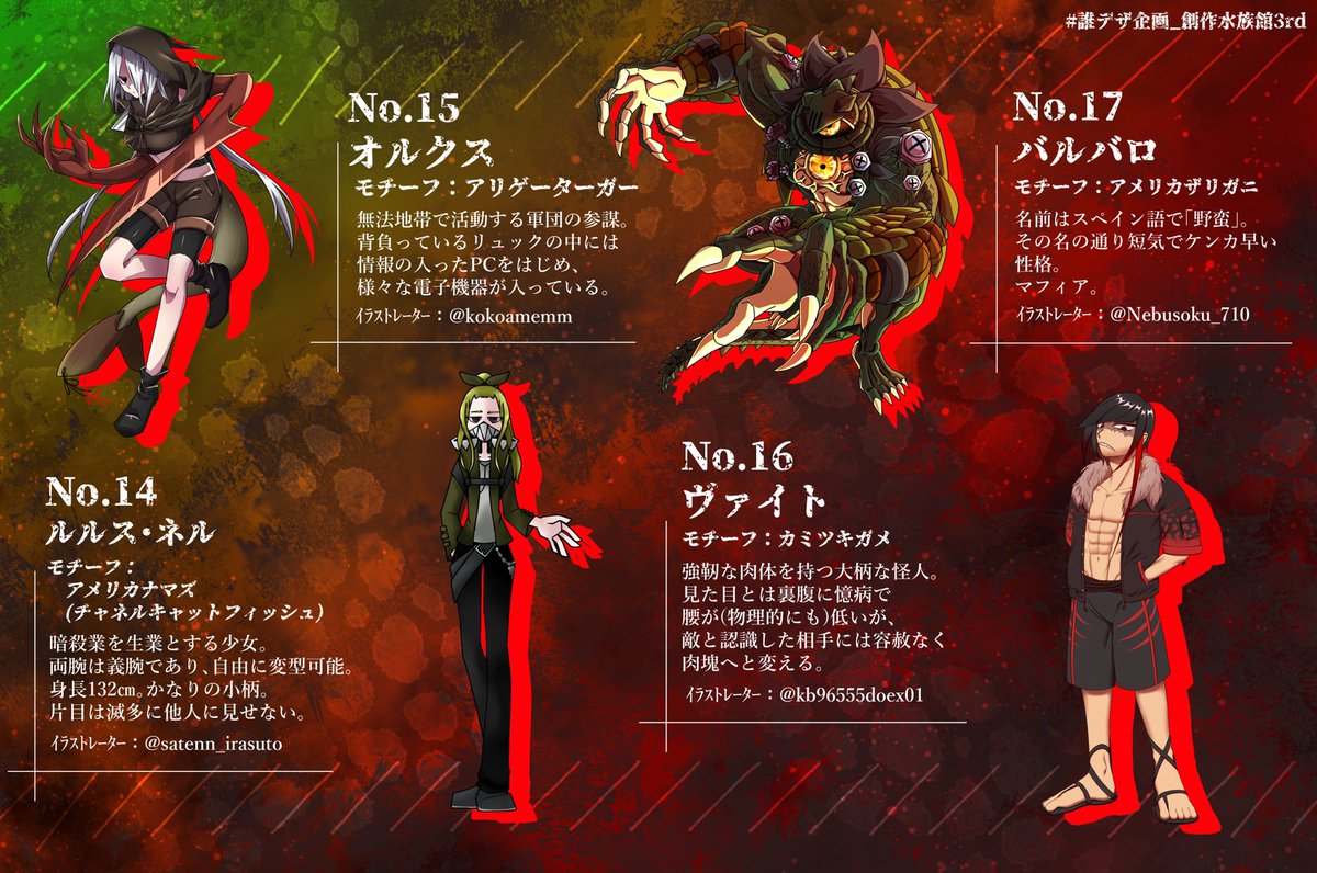 今回 #誰デザ企画_創作水族館3rd に参加!(≧◇≦) NO,14のルルス・ネルちゃんの立ち絵を 描かせていただきました!!! 初参加でしたがとても楽しく制作させていただきました! 主催の山賊タレチキンさんありがとうございましたm(__)m さて、 私がデザインした子は誰でしょう?