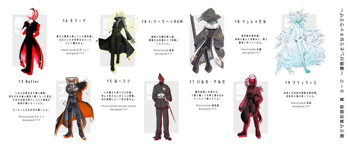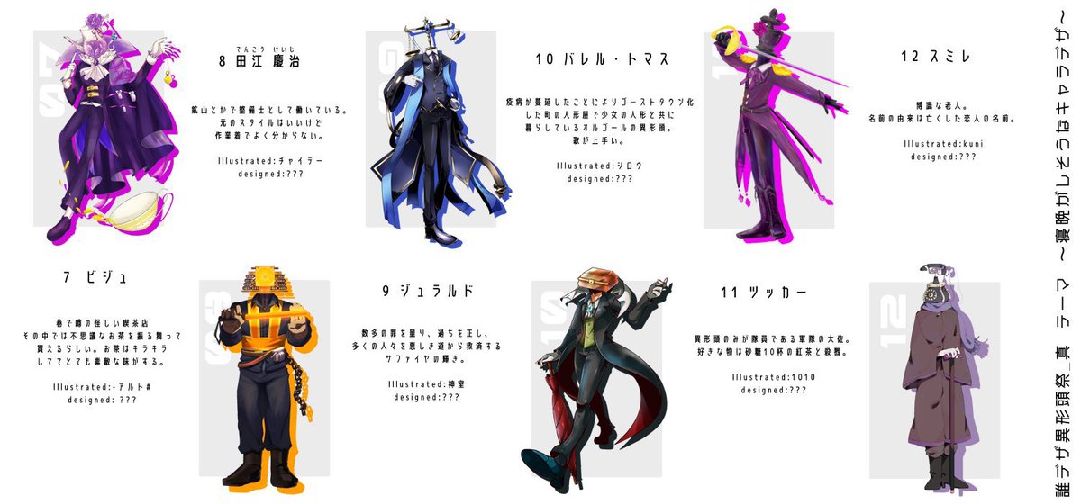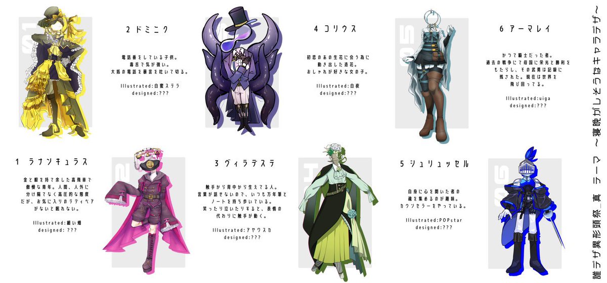 #誰デザ異形頭祭_真 今回も参加したぜ!!!祭りだ!!!私のデザインを当ててみな\\\\٩( 'ω' )و //// 私は2番のドミニクさんを描かせていただきました!お洋服かわいくて描くのがたのしかったです