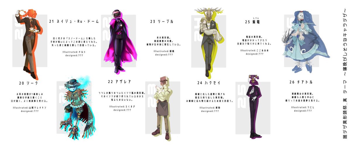 #誰デザ異形頭祭_真 ねばんさん主催の素敵な企画に参加させて頂きました! 私がデザインした子がこの中にいるので是非当ててみてください!(アンケートはリプツリーに用意してます) ちなみに私は25番の紫電さんを描きました!!